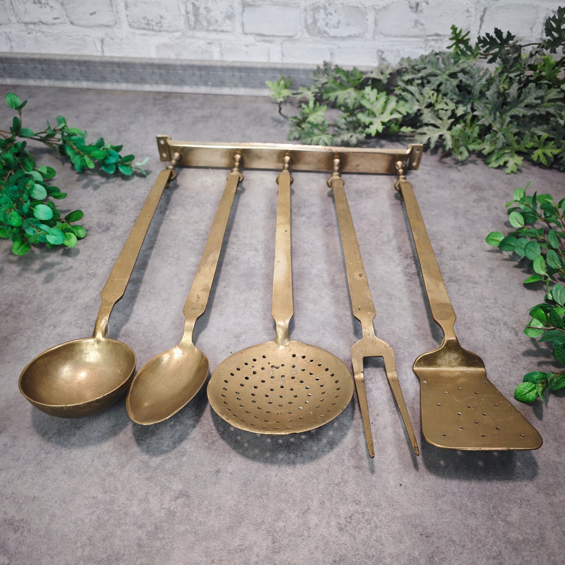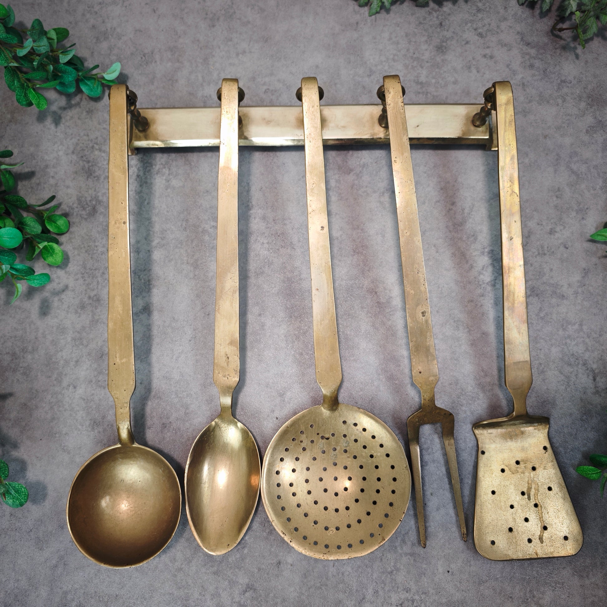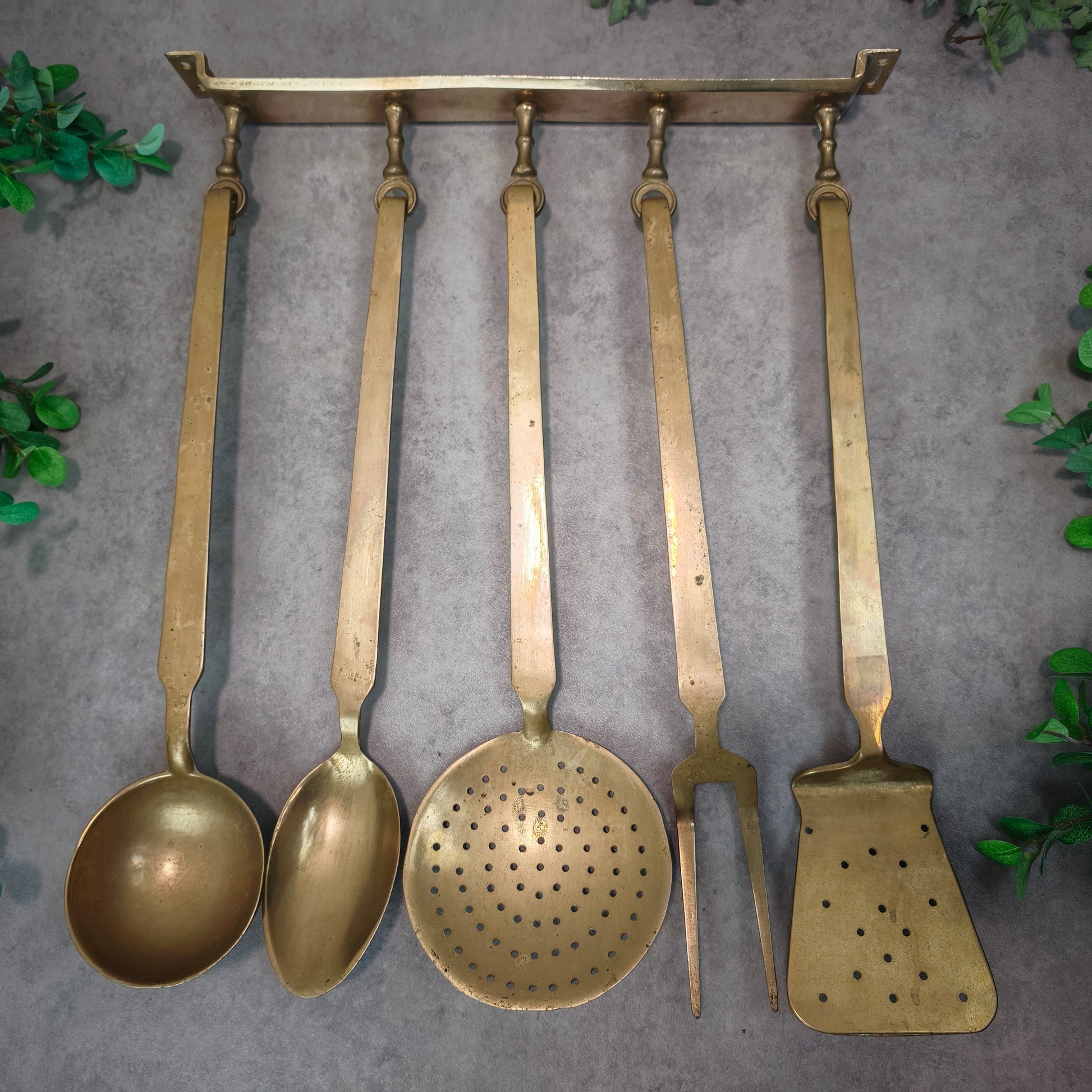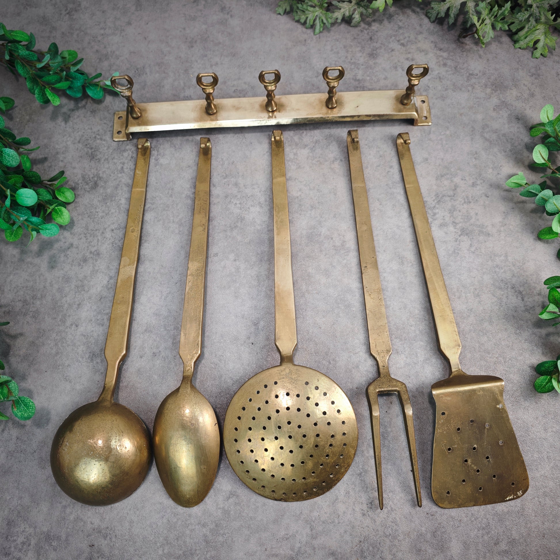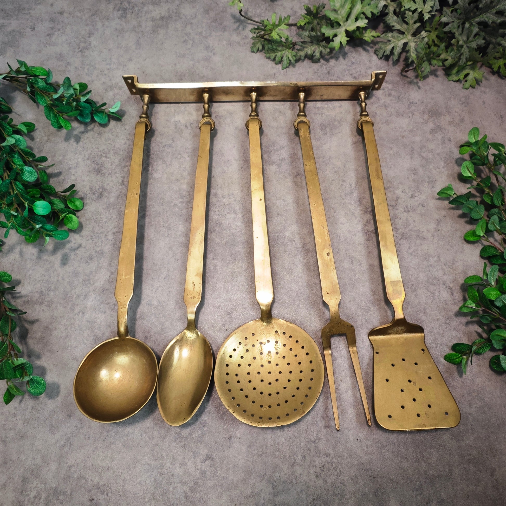 Dieses Set umfasst fünf Küchenutensilien aus Messing mit passender Hakenleiste. Enthalten sind Kelle, Löffel, Schaumkelle, Gabel und Pfannenwender. Die Oberfläche ist goldfarben, die Form klassisch.