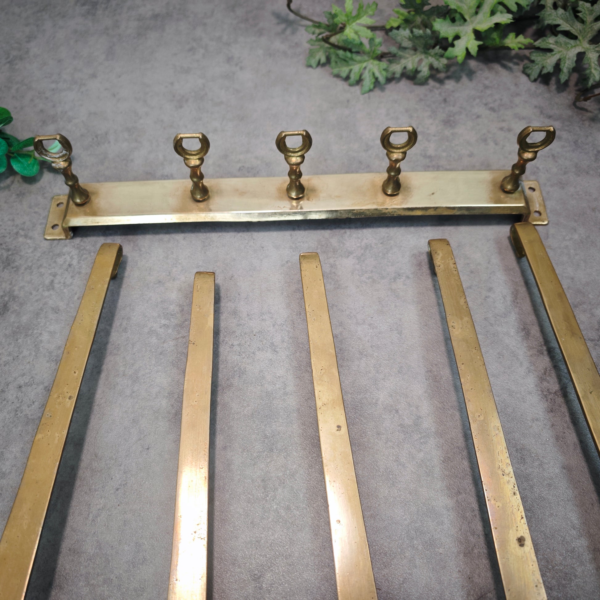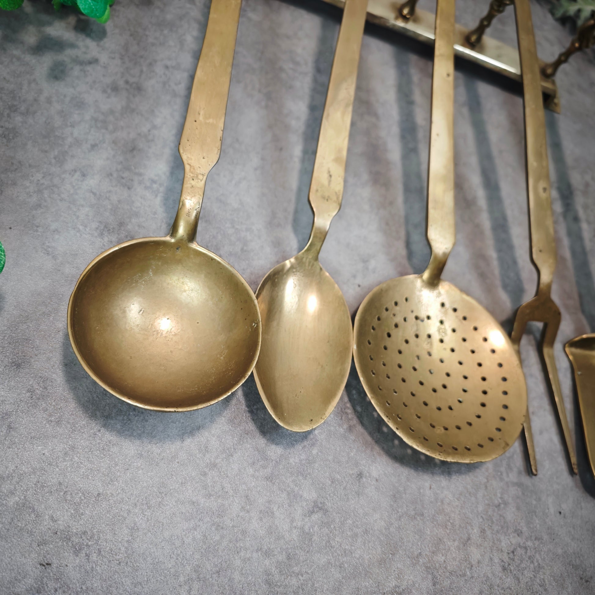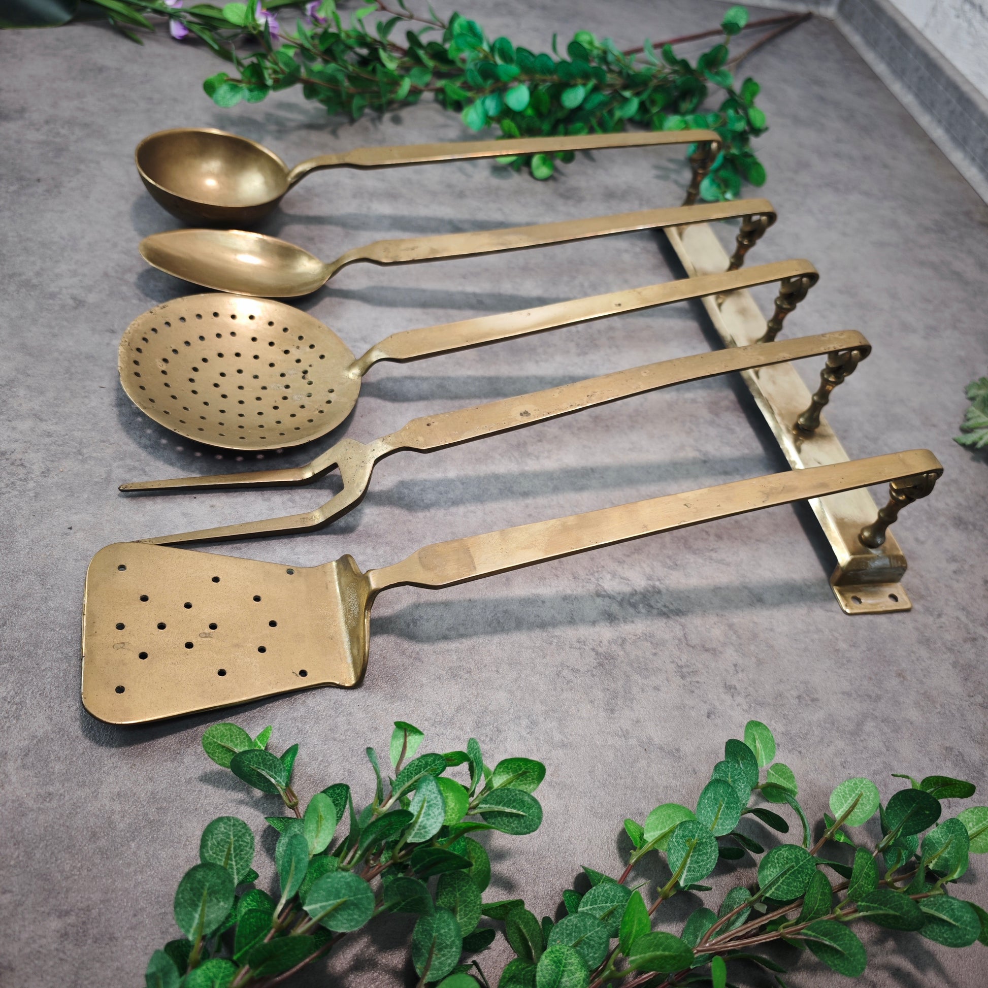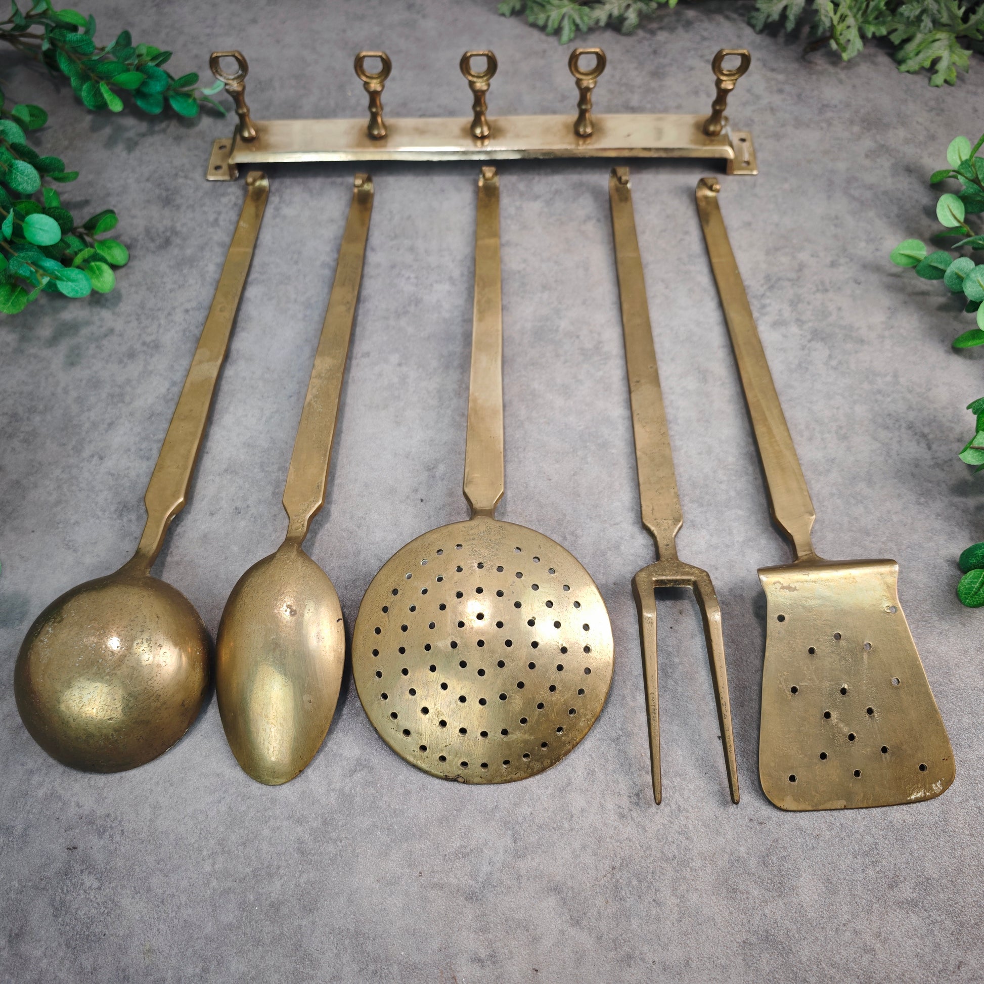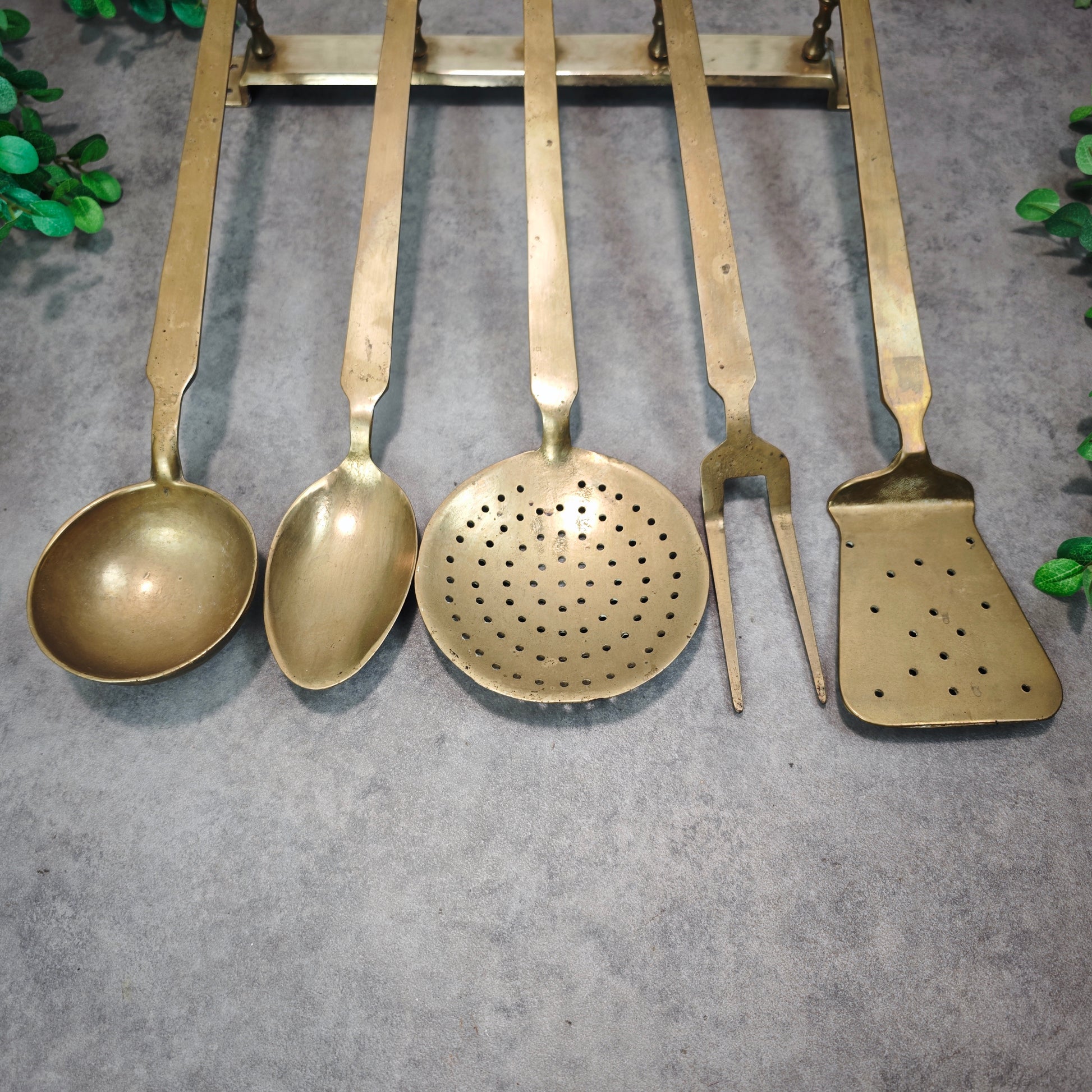 Dieses Set umfasst fünf Küchenutensilien aus Messing mit passender Hakenleiste. Enthalten sind Kelle, Löffel, Schaumkelle, Gabel und Pfannenwender. Die Oberfläche ist goldfarben, die Form klassisch.